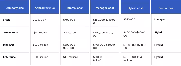 Total managed cost is often 15% to 25% lower than full internal, with materially better peak readiness.
